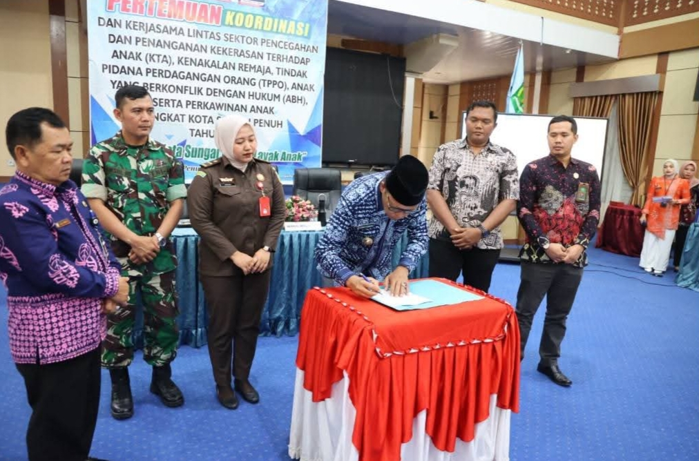 Diakhir Rangkaian Acara Wawako Azhar bersama Pemangku Kepentingan Menandatangani Nota Kesepahaman kerjasama Lintas Sektor Pencegahan dan Penanganan kekerasan terhadap anak, kenakalan remaja, tindak pidana perdagangan orang (TPPO), anak yang berkonflik dengan hukum, serta perkawinan anak tingkat Kota Sungai Penuh tahun 2025. (HMS)